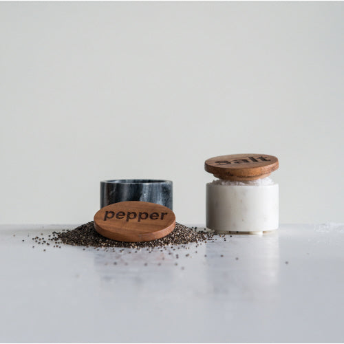 2-1/2" ROUND MARBLE SALT & PEPPER CONTAINER W/ WOOD LID, BLACK & WHITE, 2 STYLES